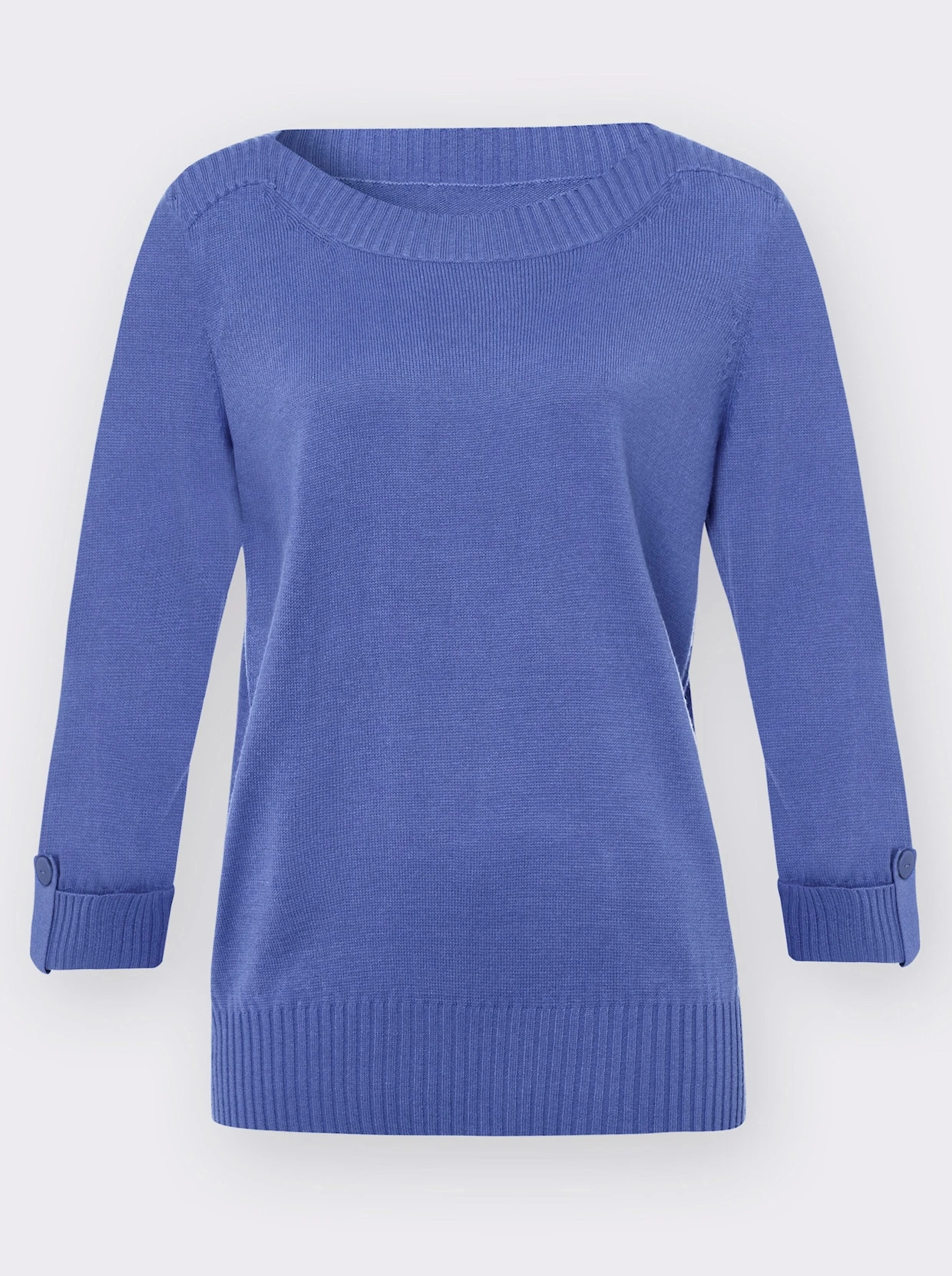Kuschelweicher Pullover mit femininem U-Boot-Ausschnitt. Die Abschlüsse der 3/4-Ärmel sind gerippt und mit einem fixierten Aufschlag und Zierknopf versehen.
