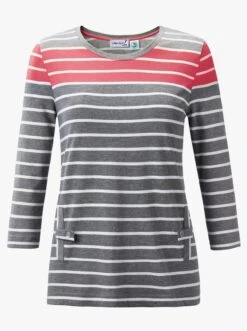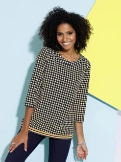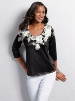 Das Lochmuster auf diesem Shirt sieht aus wie eine wunderschöne Stickerei. Durch das Bindeband am Saum fällt es wunderbar schmeichelnd. Mit paspeliertem Rundhals-Ausschnitt, überschnittenen Schultern und fixiertem Ärmelaufschlag.