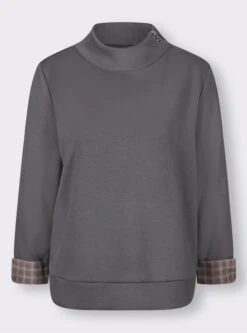 Raffinierte Details machen den Unterschied zum klassischen Basic: Shirt mit Karobesatz am Reißverschluss, der sich vom Stehkragen über die linke Schulter zieht, und an den 7/8- Ärmeln innen, wo er beim Umschlagen zu 3/4-Länge effektvoll zum Vorschein kommt.